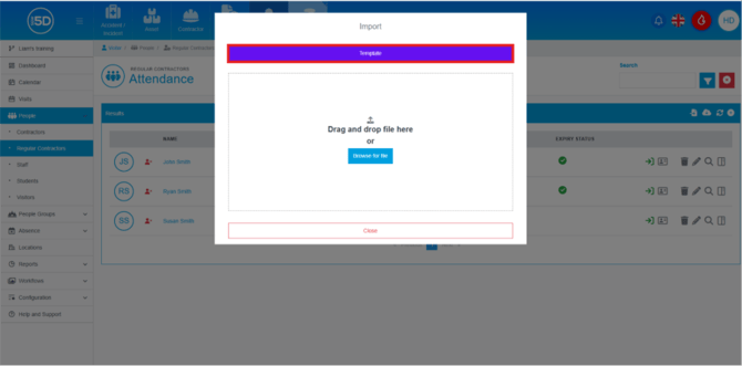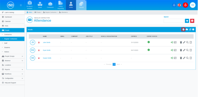 - This will take you to a list of all your regular contractors. To perform a bulk upload, click the import symbol at the top right of the ‘Results’ box.