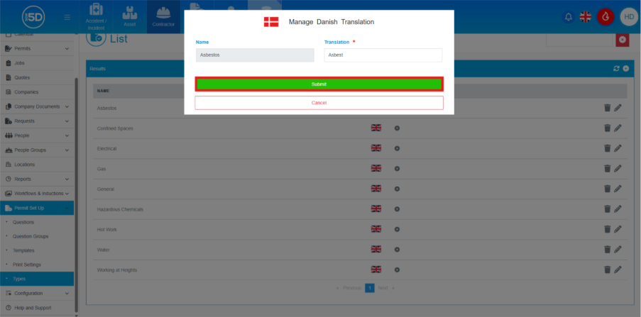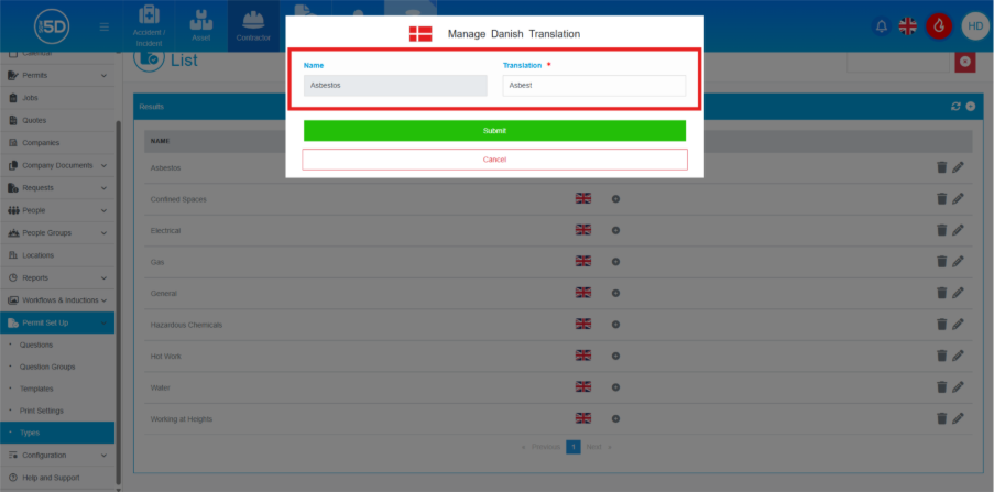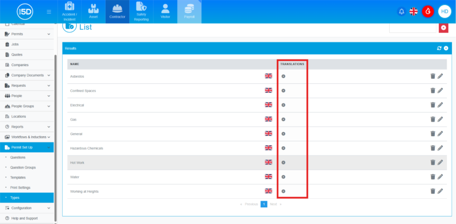 - This will take you to a list of currently created permit types. To add a translation, click the plus symbol of the type you want to translate under the translation column.