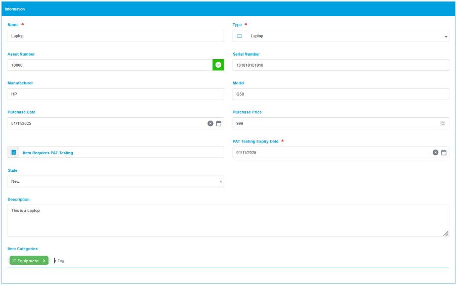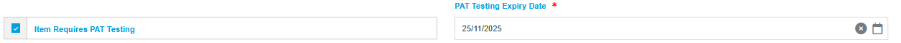 - If you want to track the PAT Testing status of this item, tick the Item Requires PAT Testing box. You will then need to enter a ‘PAT Testing Expiry Date’.