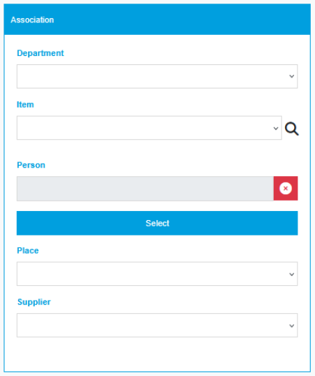 - The last section involves setting your new item’s association with other records in the system. You can assign any combination of Department, Item, Person, Place, and Supplier using the dropdown fields. This will link the item to the selected records.