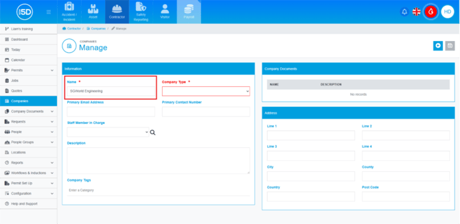- Next, add a company type using the ‘Company Type’ field. This determines what documentation is required for that contractor company.