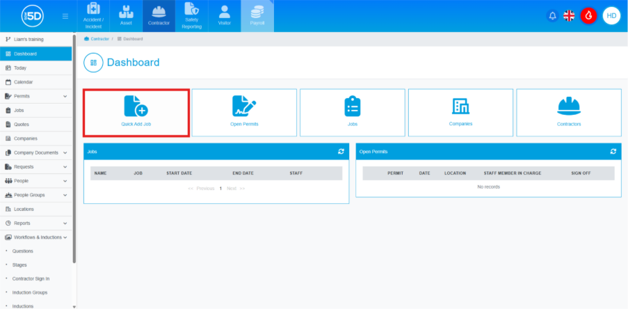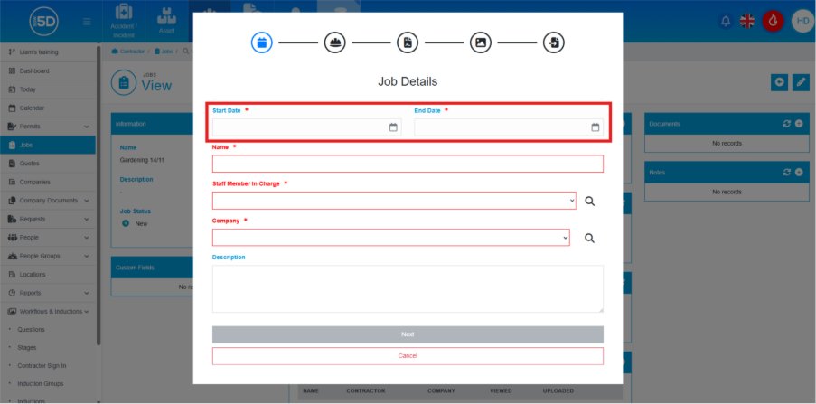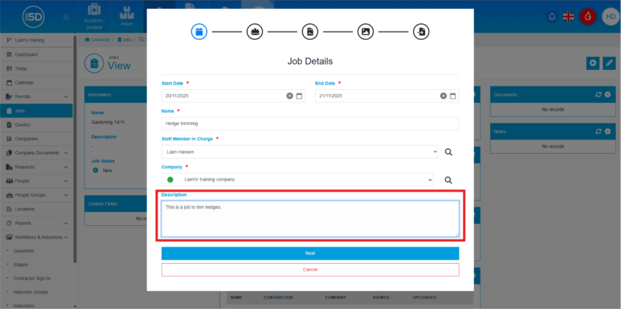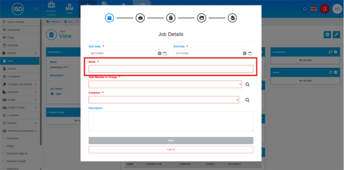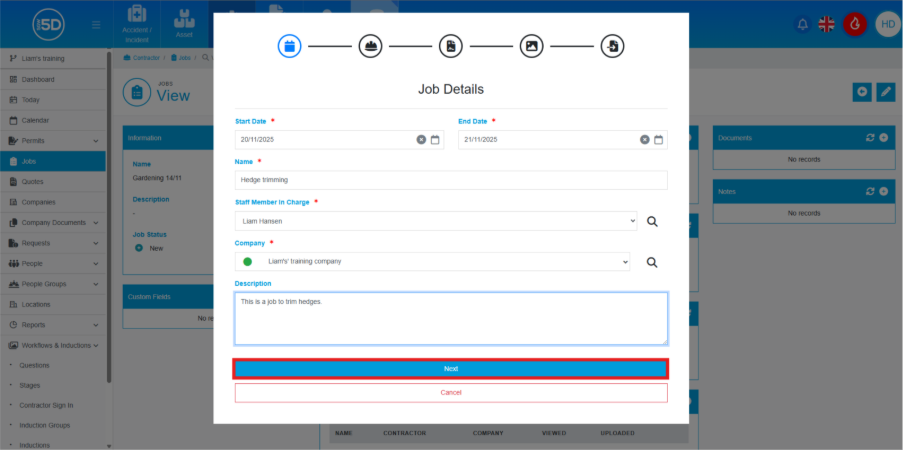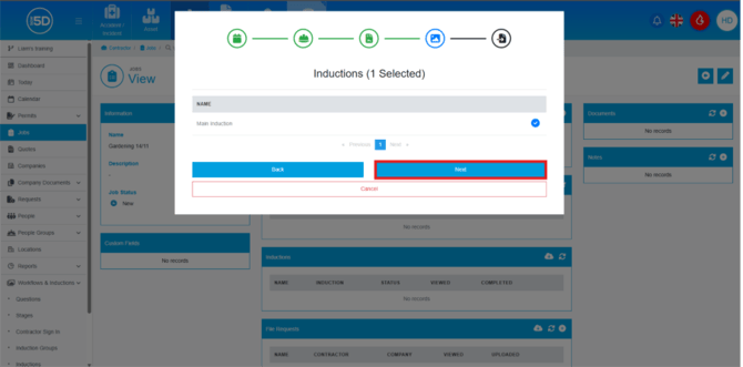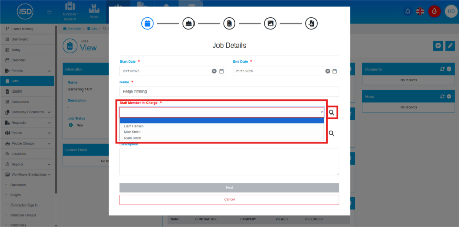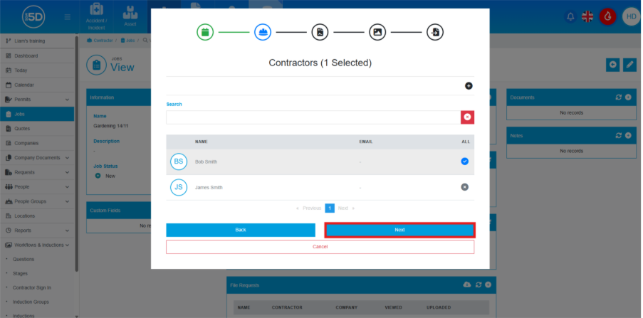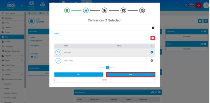 - You do not have to add any contractors as you might not know who is coming until later. You have the option to add contractors to the job event later. Click ‘Next’ to progress to the next page.