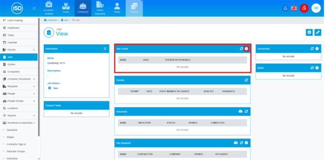 - This will take you to the job ‘View’ page. To create a job event, click the plus symbol int the top right of the ‘Job Event’ box. This is in the centre of the page, at the top.