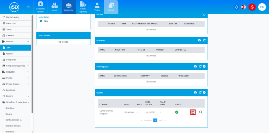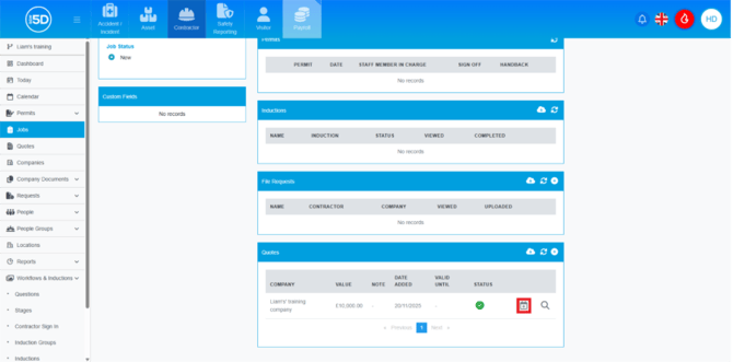 - Alternativity, if you have a quote and it has been accepted; a calendar button will appear, clicking this icon will take you into the event creation page. This will fill in the ‘Company’ field when you start creating the job event, rather than filling it out later.