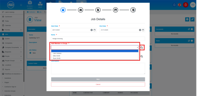 - Below that is ‘Staff Member in Charge’. You can either, open the drop-down box and search through a list or click the magnifying glass next to the field box to search for specific record. Whoever is selected will be notified of change on the job, such as inductions being completed or files being sent in for review.