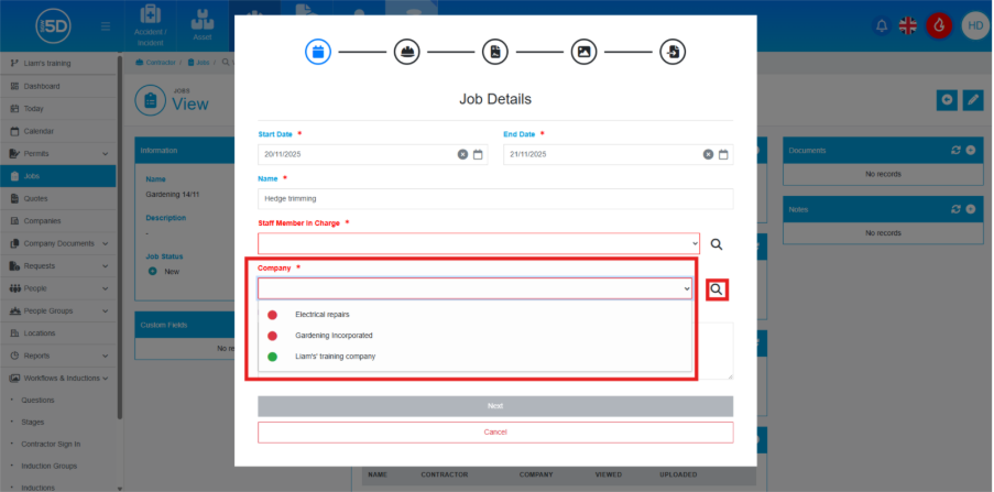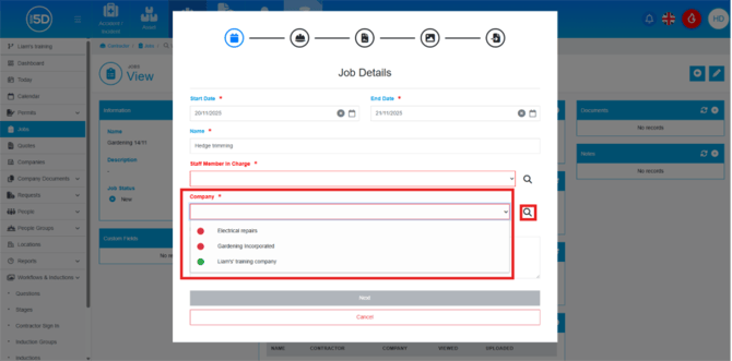 - In ‘Company’, it is the same as ‘Staff Member in Charge’ you can use the drop-down to search the entire list or use the magnifying glass next to the field to search for specific company. You will see that some of the companies have coloured circle next to their name, this indicates if they have all their documentation up to date, such as liability insurance. Depending on your insurance level, which is set in settings, you can prevent a company form being selected.