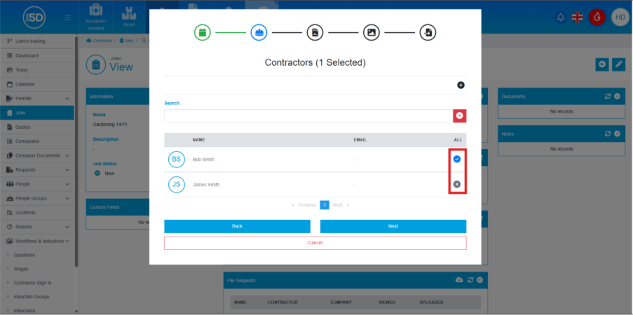 - This will take you to a new page with a list of contractors, this will only look at contractors that are assigned to the company that was selected in in part e. You can select which contractors are coming to the site by clicking the x on the row of their name. This will turn from a X to tick showing that they have been selected.