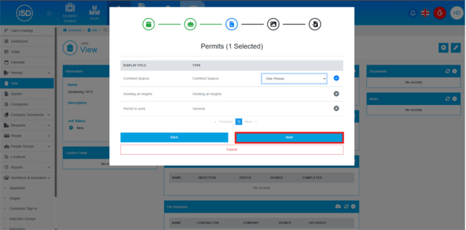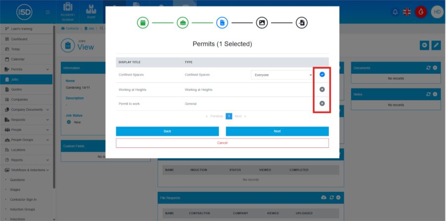 - You will now be able to select what permits are going to be added to the job event. Just like selecting a contractor, click the permit you want to add, and the X will turn to a tick indicating that it has been selected.