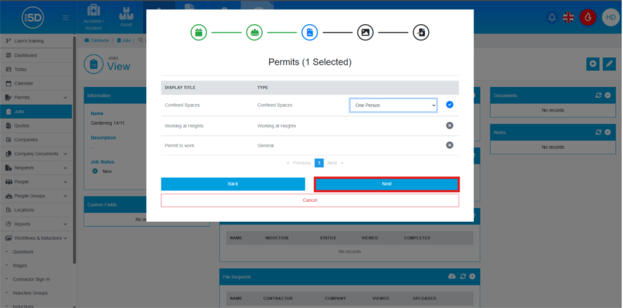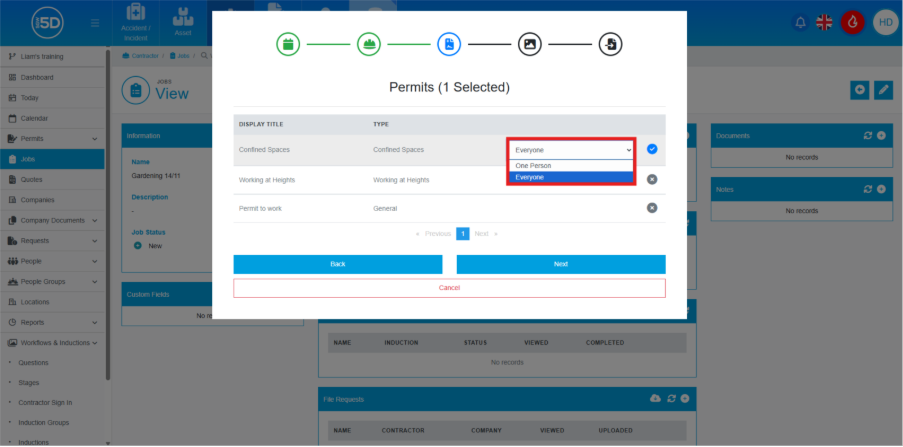 - Any selected permits will now appear with a drop-down box. This so you can select if you only want one person to fill out the permit or everybody to fill out a permit. It is defeated to ‘Everybody, so make sure this is changed if you only want one person to fill out the permit.