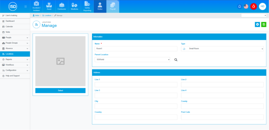 - You can add a picture of the room. Clicking ‘Select’ will give you the option of adding a photo from a file or using an onboard camera, to take a photo of the location.