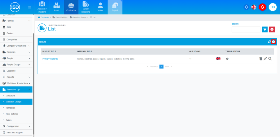 - This will take you to a list of all your permit groups. To create a new question group, click the plus symbol in the top right of the results box.