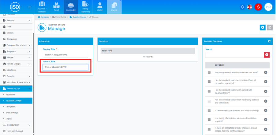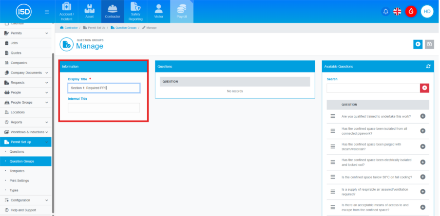 - You will now be taken to the area where you can create your question group, starting with the ‘Information’ box. Begin by entering the ‘Display Title’, which will be the name of the group.