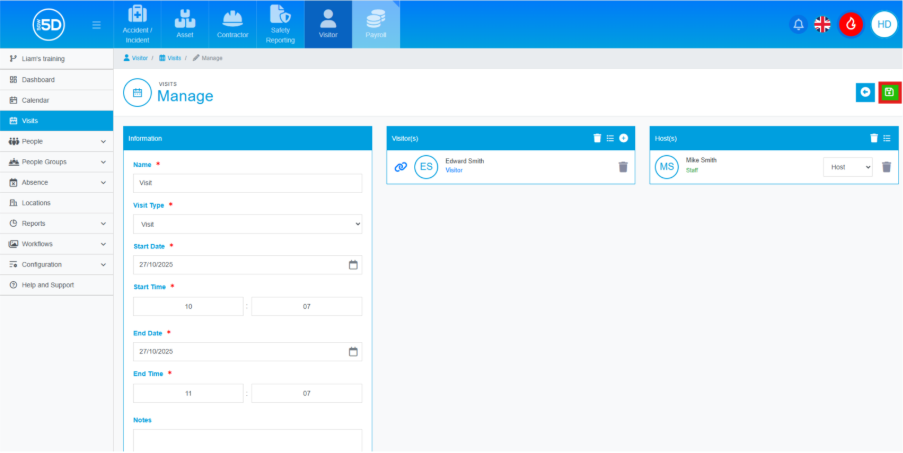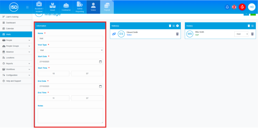 - To edit the pass duration for a visitor, click the event name under the ‘Event’ column in ‘Visitor and Contractors’.