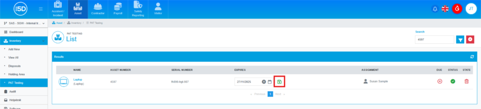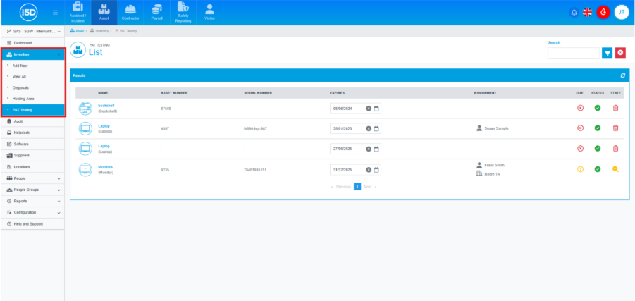 - Using the left-hand navigation menu, click ‘Inventory’ and then ‘PAT Testing’.