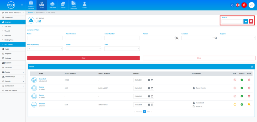- You will now see a list of all items on the system that have been setup for PAT Test tracking when added to the system. You can use the search bar in the top right to look for a specific item or click the blue Filter icon sort the list further.