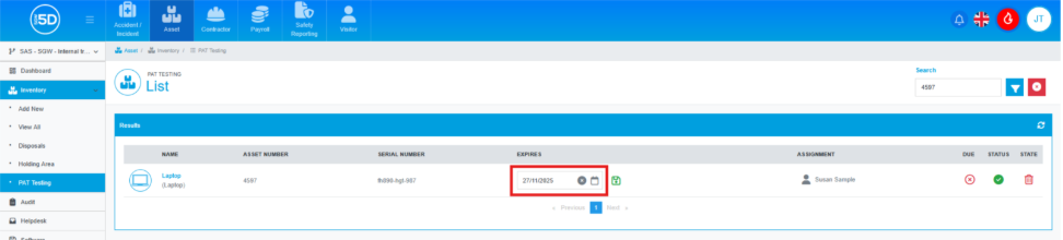 - Find the item you wish to update and then change the ‘Expires’ date to the new test expiry date.