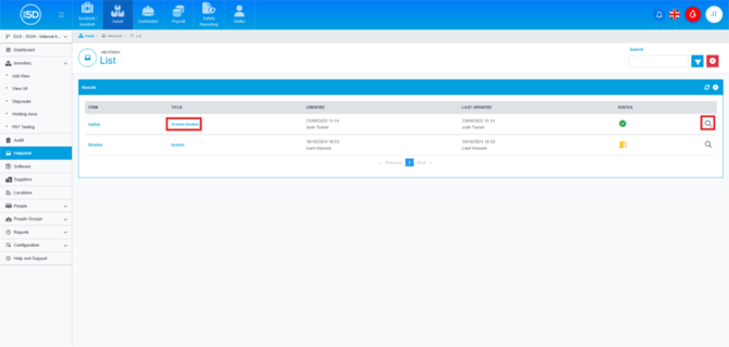 - You will now see a list of all active tickets, click on the magnifying glass icon or the blue text under Title to go into the ticket.