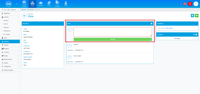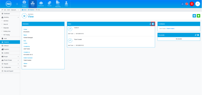 - You will now see the ticket information. The notes section will show you any previous notes left under the ticket. You can add your own note by clicking the Plus button.