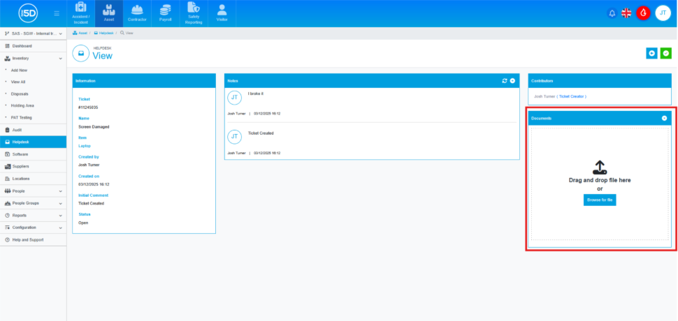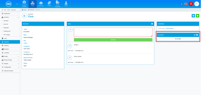 - You can upload documents to the ticket by clicking the plus icon in the Documents section.