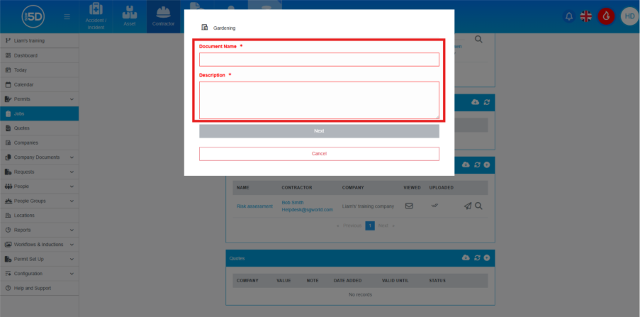 - An overlay will appear. You will need to complete both the ‘Document Name’ and ‘Description’ fields. These are mandatory and must be filled in.