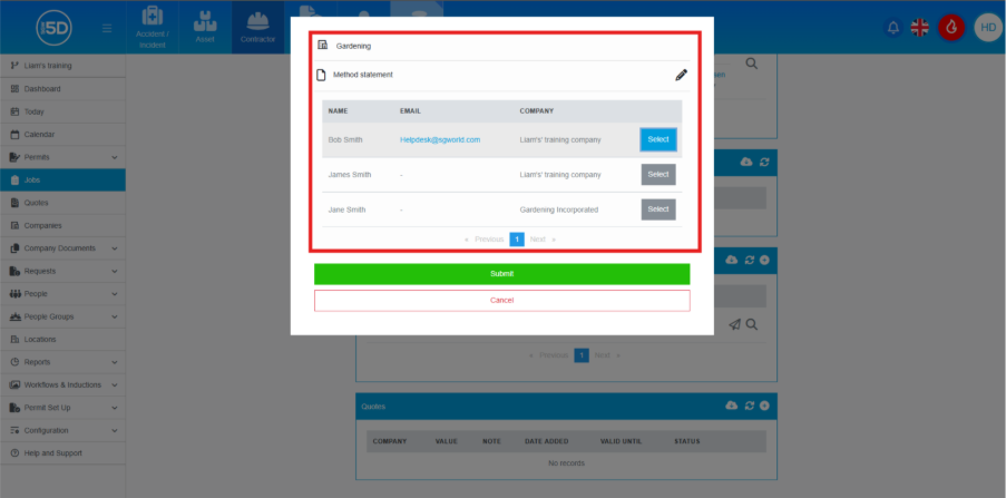 - This page allows you to select which contractor will receive the file request. It will display which contractors have an email address and can receive the request. Click the ‘Select’ button next to the contractor you want to choose. The button will flash blue to confirm selection.