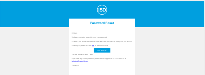 - On submitting a reset request, you will receive an email asking you to reset your password. Select the ‘Click Here’ button.